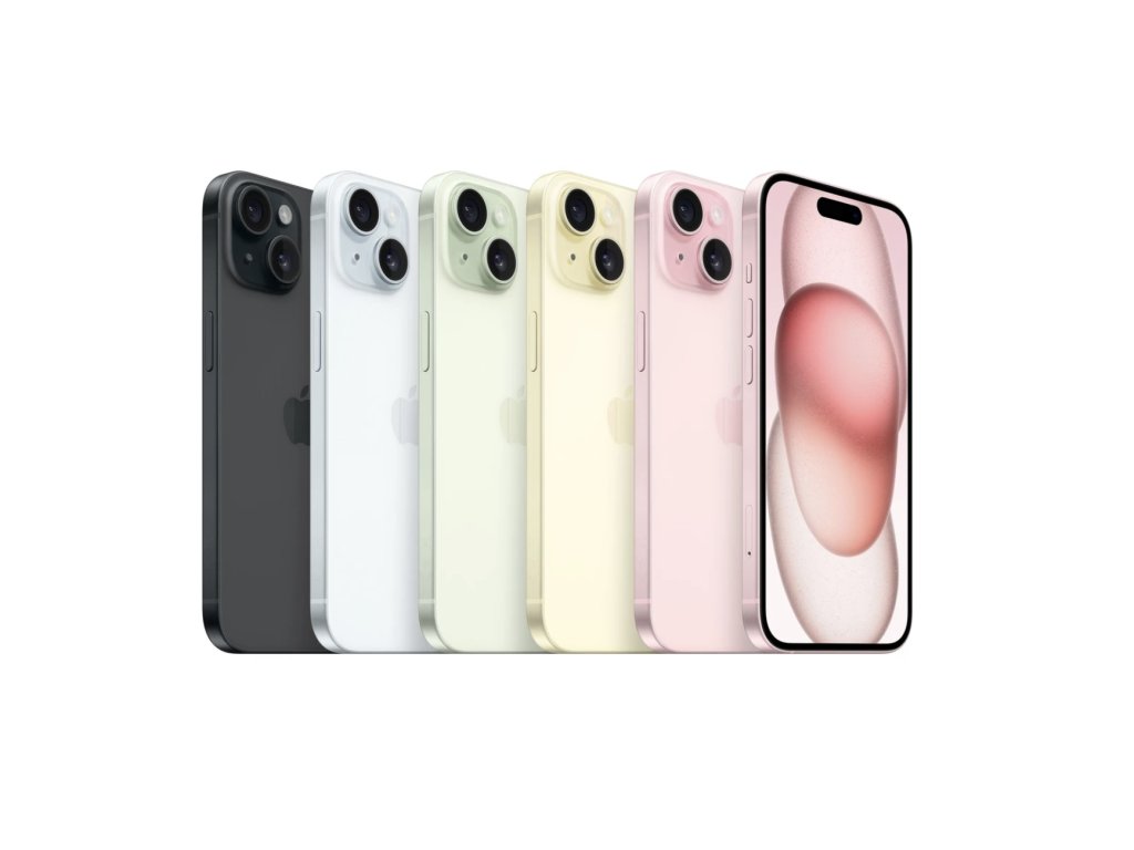 iPhone 15 je dostupný v kapacitách 128 GB, 256 GB a 512 GB a v pěti elegantních barvách – růžové, žluté, zelené, modré a černé.