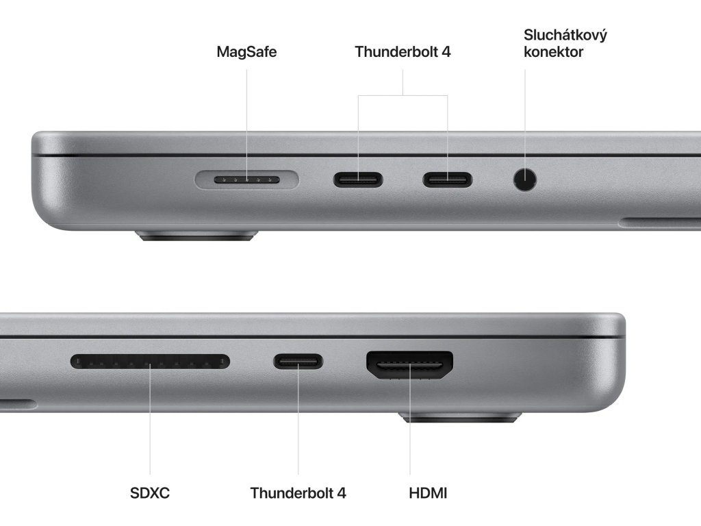 Konektivita: 3× Thunderbolt/USB 4, MagSafe 3, HDMI, slot na SDXC kartu a 3,5mm sluchátkový konektor